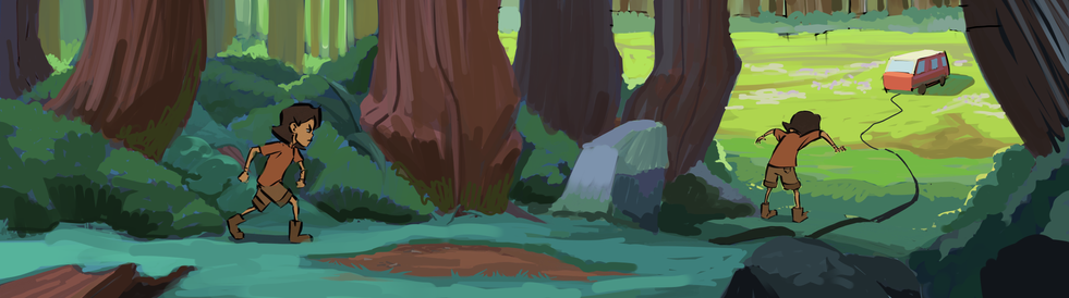 Sometimes in this process we also try to give suggestions and critique in the most useful way we can, and sometimes that comes in the form of paintovers. These usually become more of a push and pull of advice, going back and forth, that turns into a much better result all around. Here is one example where Rithyra and I tried to find ways to improve a background he had done that was actually already working quite well. The top one was where Rithyra started and the second is where it ended in a more refined stage. and the cools of the forest worked great before we got to the Van. We made suggestions about lighting, and in my paintover I tried to see if maybe we could make the falloff of hue in the trees to go less quickly to blue and experimented with the idea of bringing more of a light into the forest at the leftmost part of the painting. The eye level was another thing we experimented with since in the storyboard our character was drawn quite high up. We had also experimented with perhaps darkening the trees to help frame things better, especially in the foreground like the rocks. We didn't want to go too dark though, and this went back and forth for a bit longer.